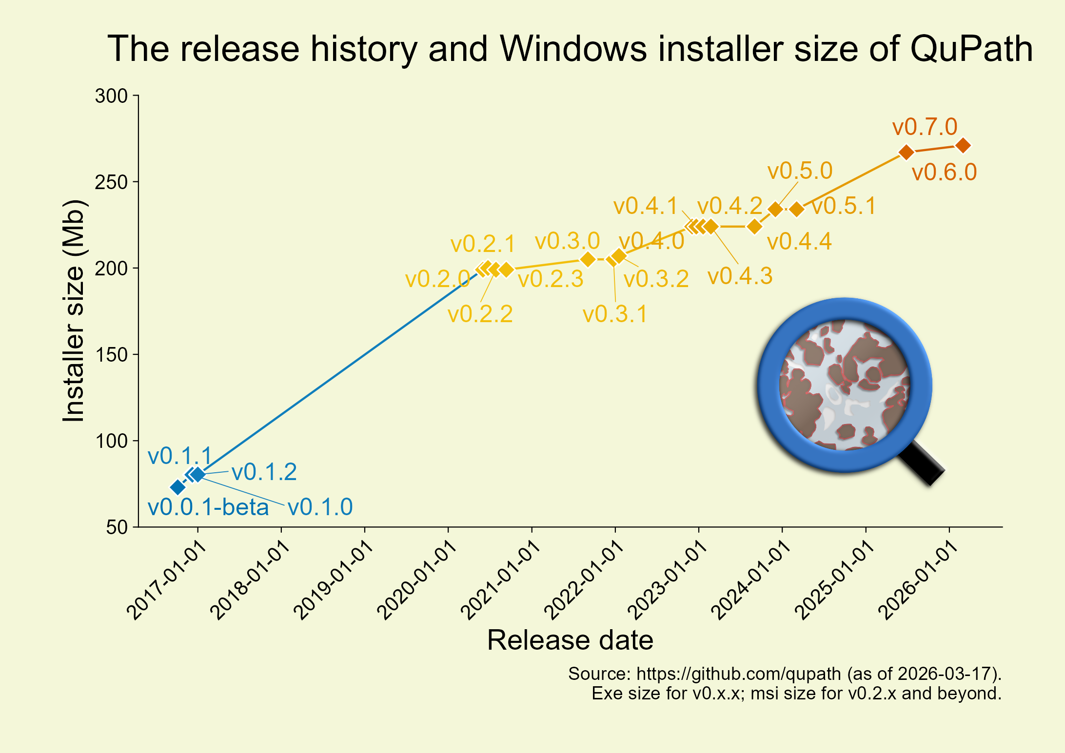 add_caption(paste("Source: https://github.com/qupath (as of 2026-03-17).", "Exe size for v0.x.x; msi size for v0.2.x and beyond.", sep = "\n")) |>